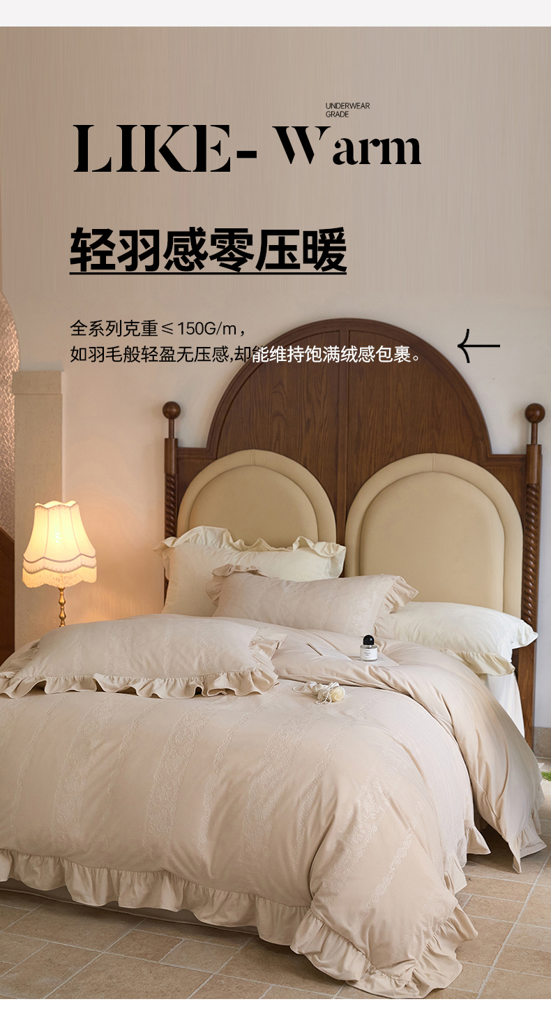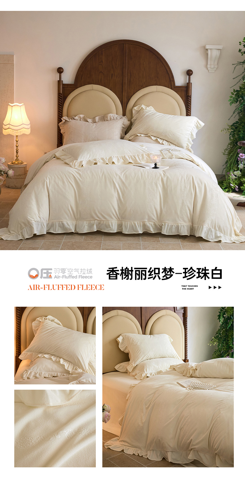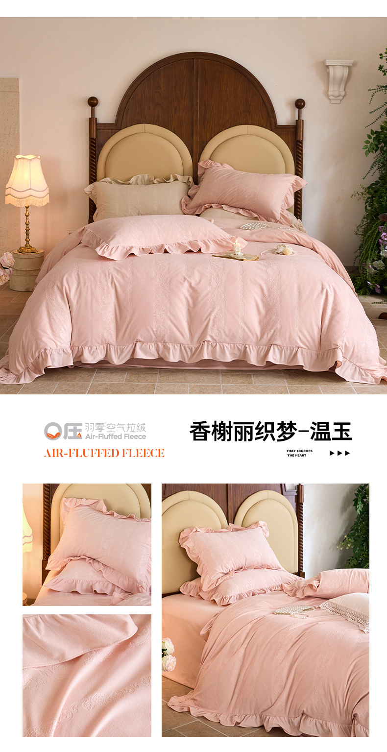 金奇达家纺 2025保暖新款羽零™空气拉绒加厚荷叶边四件套热压纹【香榭丽织梦】 (会员减45元)全网控价标准号(折后券后)不低于199元 香榭丽织梦-温玉