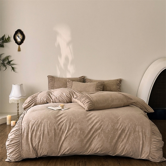 金奇达家纺 2025新款羽零™空气拉绒四件套热压纹四件套-【爱丽莎】 热压纹【爱丽莎】系列,标准号全网控价(折后券后)不低于218元 会员减45元 爱丽莎-浅咖