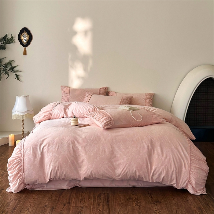 金奇达家纺 2025新款羽零™空气拉绒四件套热压纹四件套-【爱丽莎】 热压纹【爱丽莎】系列,标准号全网控价(折后券后)不低于218元 会员减45元 爱丽莎-浅粉