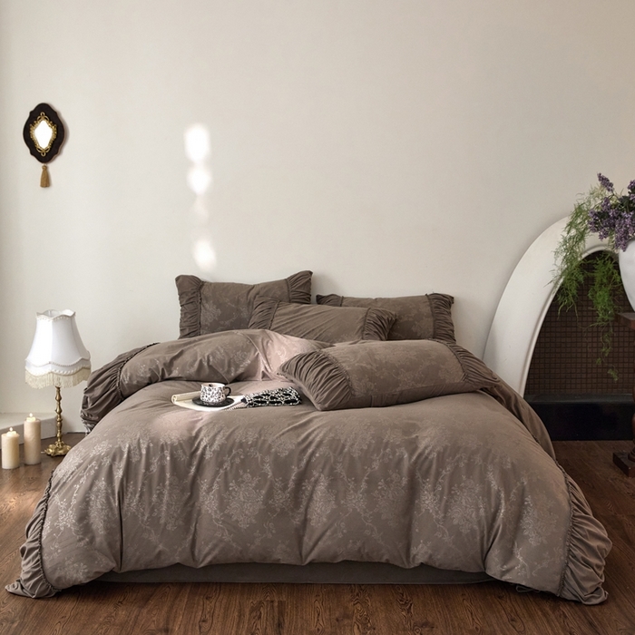 金奇达家纺 2025新款羽零™空气拉绒四件套热压纹四件套-【爱丽莎】 热压纹【爱丽莎】系列,标准号全网控价(折后券后)不低于218元 会员减45元 爱丽莎-深咖